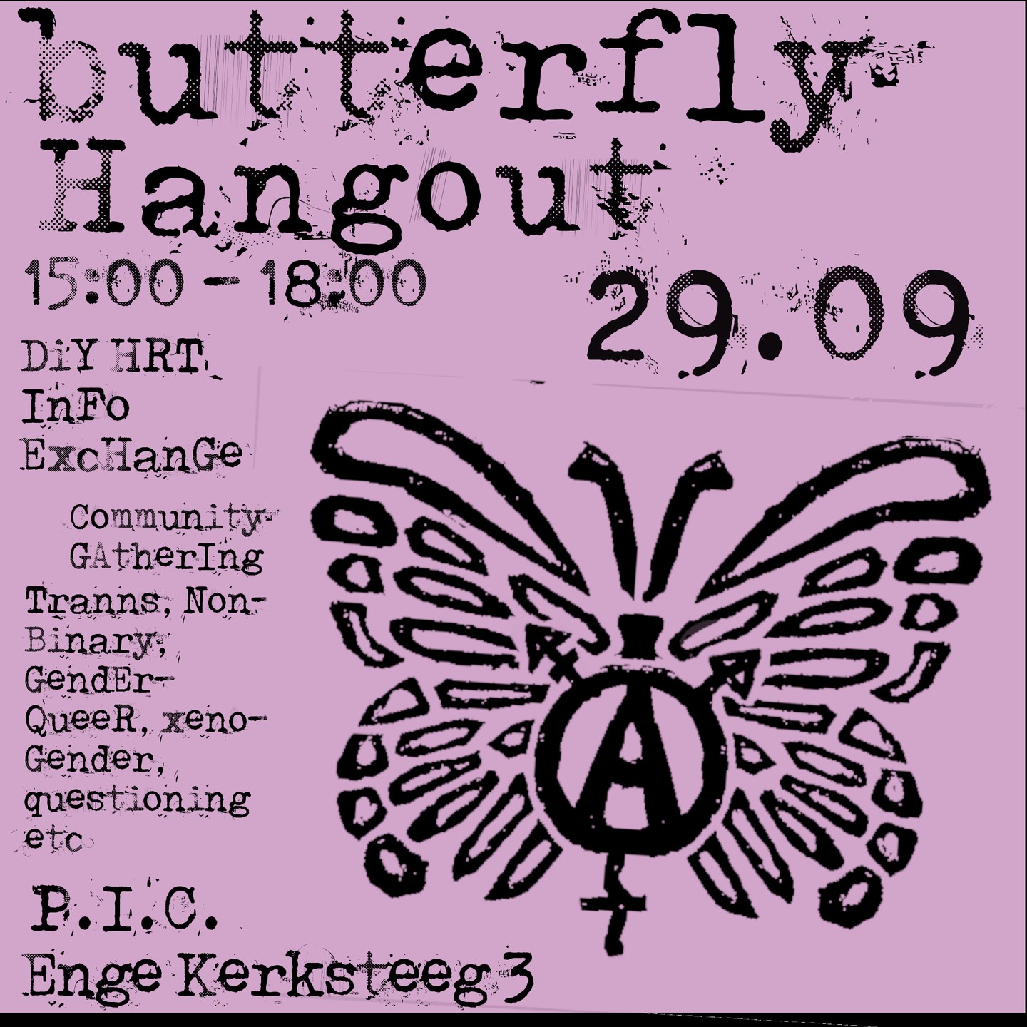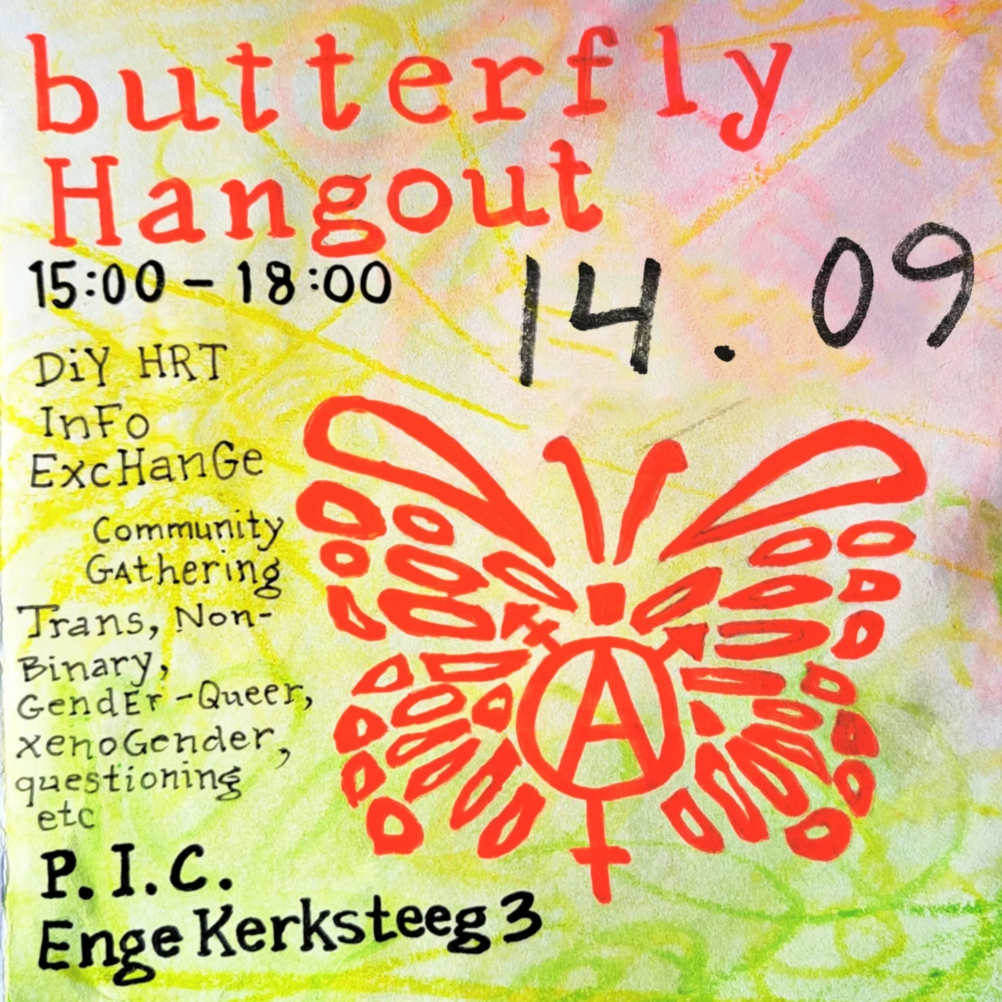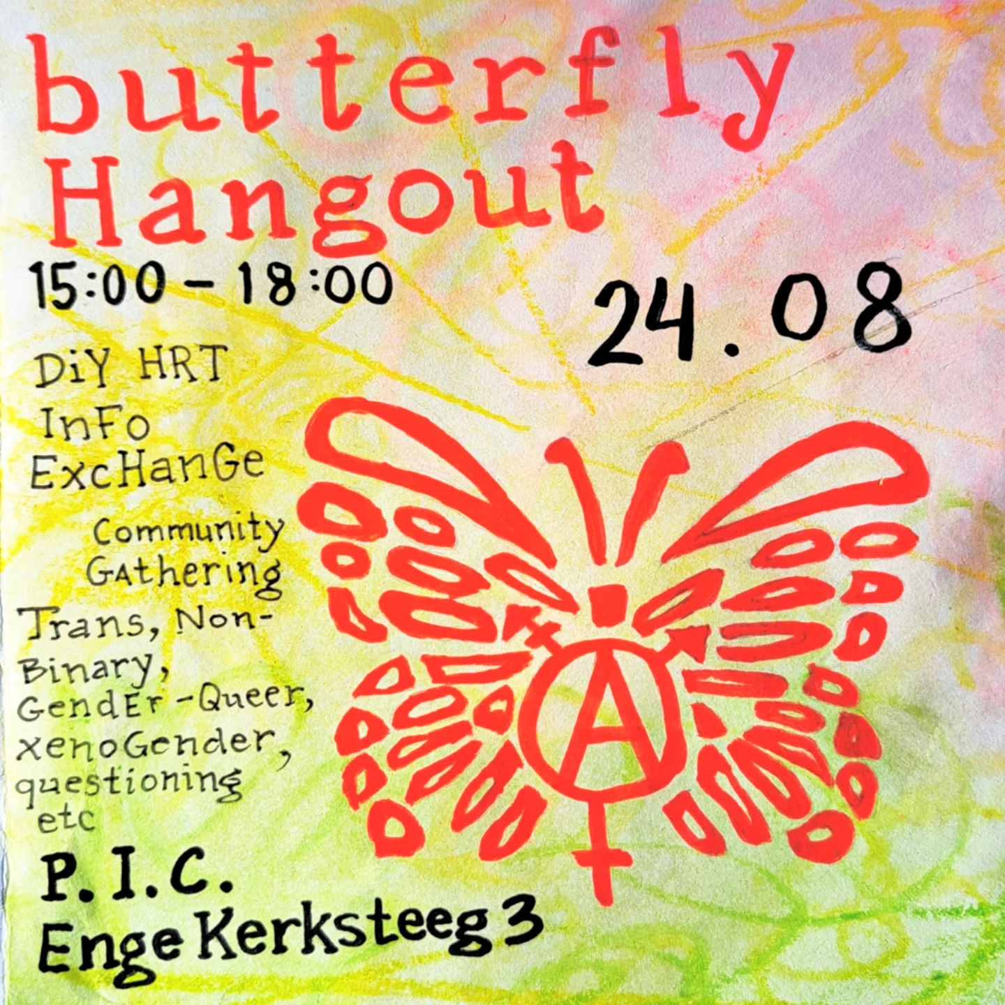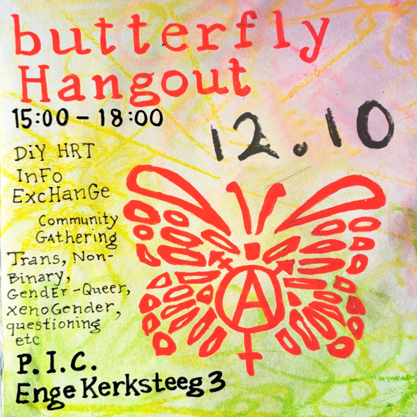 Hiii! Upcoming Sunday 25th at 15:00, you’re welcome to join the monthly butterfly hangout <3 Come by for a coffee, tea or who knows what at the PIC. Excited to share the space with everyone again :3! For all those not yet in the know, butterfly is a trans-focused, horizontally-run community space. We organise hangouts, skillshares, and anything else people excited for. Oh and by the by... enbies, genderqueers, eggs and allies, you’re also more than welcome to swing by! <3 The event will take place from 15:00 until 18:00, 25th of August, at the Prostitution Information Center (Enge Kerksteeg 3), cya there!!!!! UwU