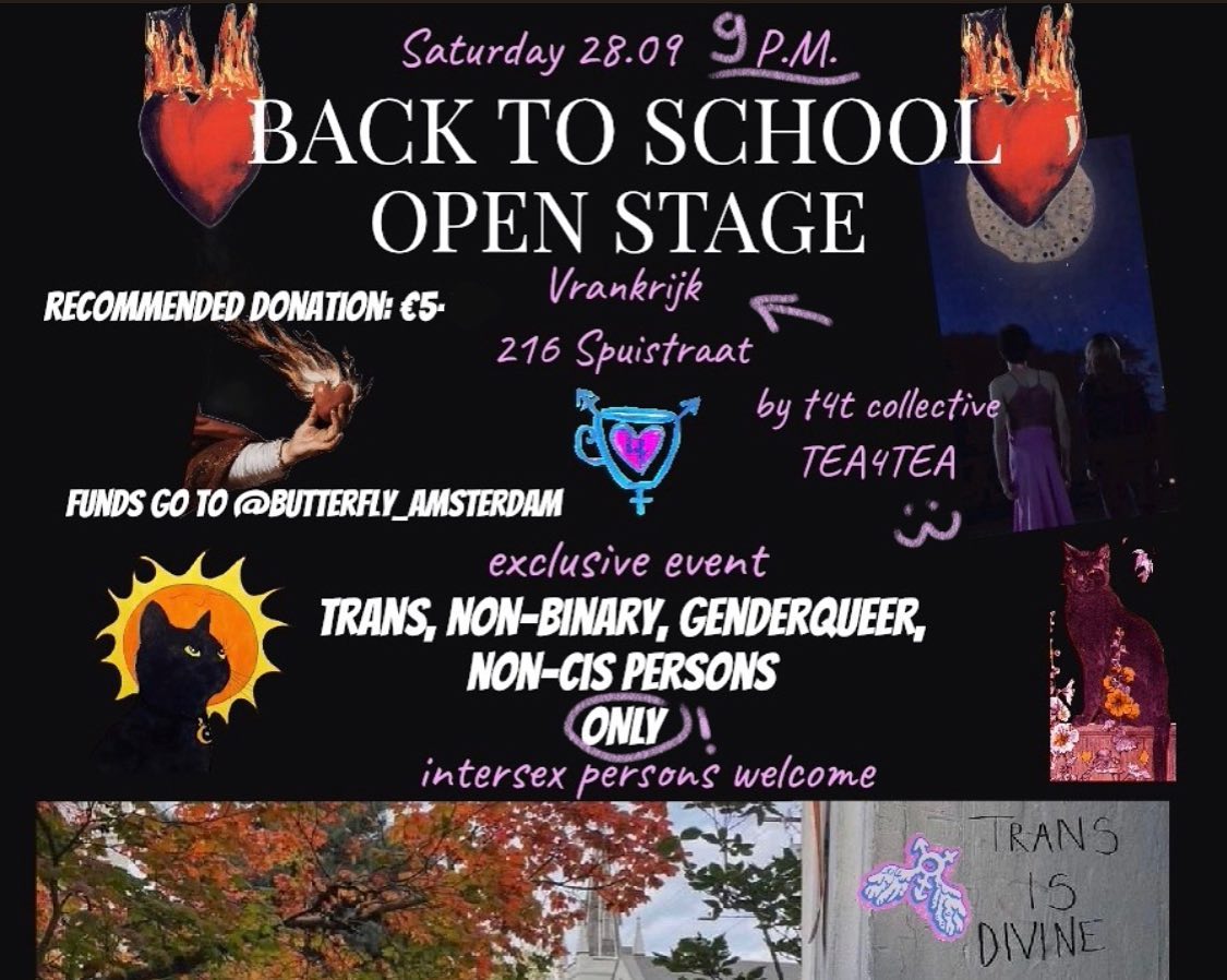 It’s back to school season aaaaand Tea4Tea Collective is bringing all the tschoolboys, tschoolgirls, and every cutie in between & outside, a night of music, performance, and anything else you’ll bring to the open stage at one of our favorite queer social spaces @wtfqueerwednesdays📚🧑🏫🤓 With doors opening at 9, we’ll first hear from classroom super star mesin slat (@necroslat) who’ll start our night with a fire set!! 🔥ʚ(。˃ ᵕ ˂ )ɞ🔥 then we’ll open the stage for you to show off your first day fits and/or show us what talents you’re bringing to school with you 🤭 If you want your class picture taken, we’ll have @ninjinada behind their camera, so you can take a memory of the start of the school year home with you 📸📓 and closing our nite will be 2 more classroom superstaaars unluca★★★ (@unluca999) followed by a mysterious 3rd DJ ꒰ᐢ. .ᐢ꒱₊˚⊹ ᰔ This party is exclusively for trans, nonbinary, genderqueer and non-cis people!! 🏳️⚧️ the school halls we always dreamed of 🏫😍 door sales and donations will go to @butterfly_amsterdam 🦋, the sweet trans-led collective hosting monthly hangouts at the PIC, sharing vibes, resources, knowledge and snacks <3 the talented designers behind this beautiful poster: @magicks_collective 💕💕