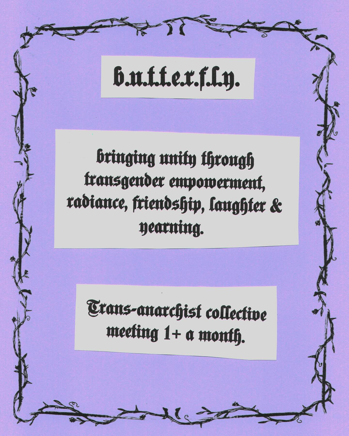 "heyo! after having to be postponed last weekend, we are back! the next butterfly event will be this sunday, may 26th. come by and have some tea or coffee with other trans and non-binary people :) Butterfly is a trans only space (and yes enbies you are more than welcome too <3) The event will take place from 15:00 until 18:00 at the Prostitution Information Center (Enge Kerksteeg 3), cya there!!!!!"